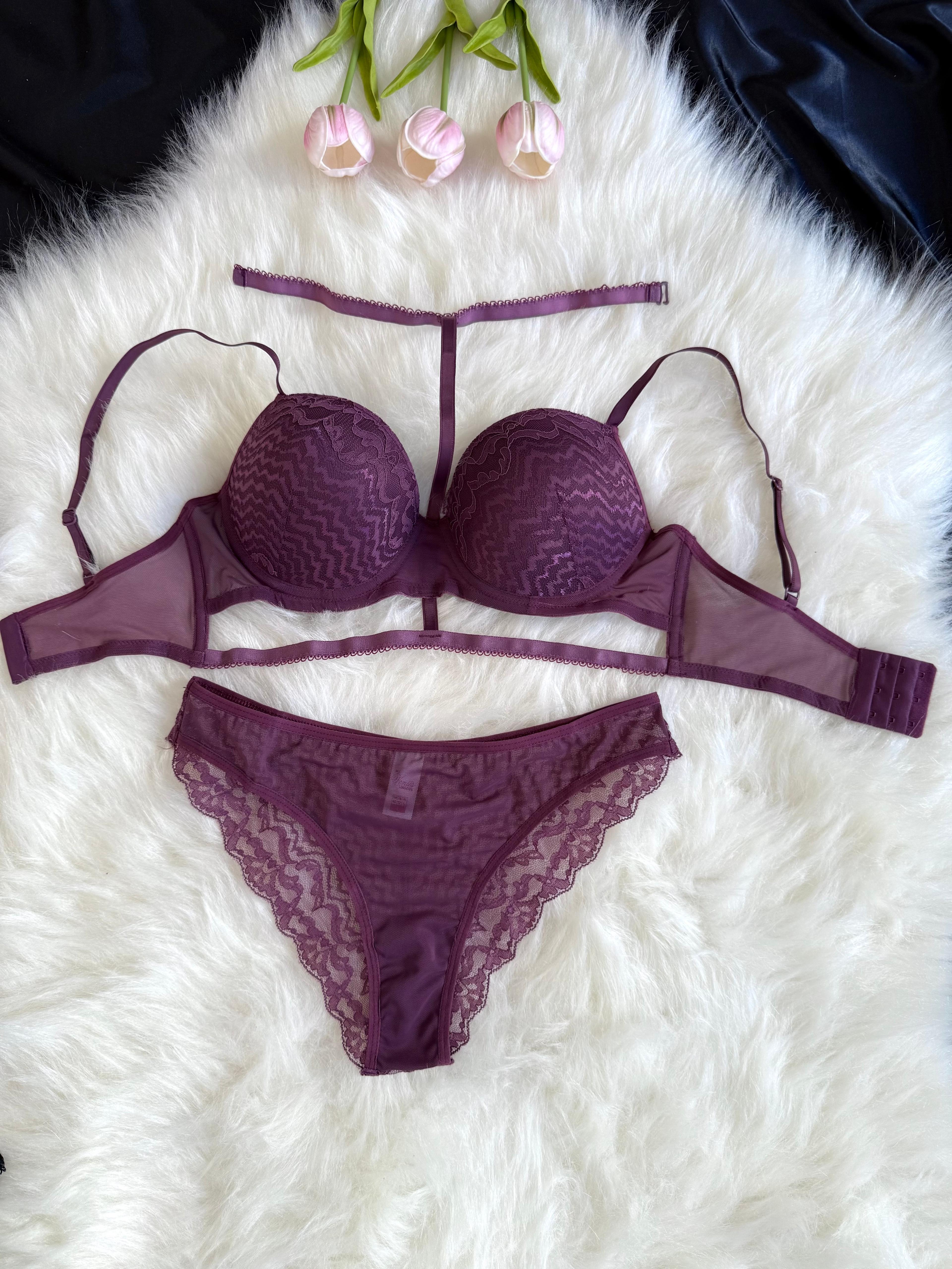 Mor Dolgulu Balenli Boyun Detaylı Sütyen Takım