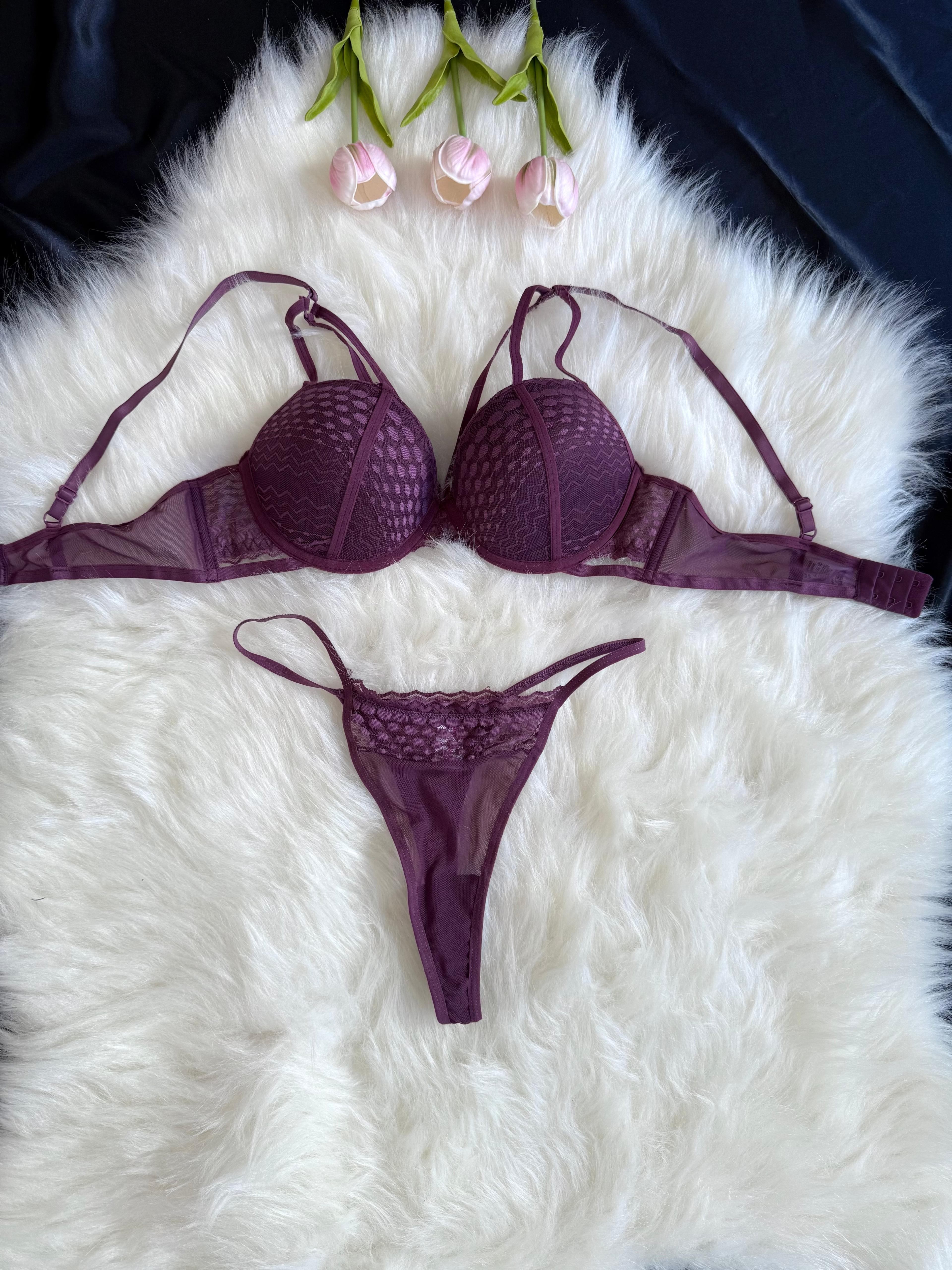 Mor Dolgulu Balenli Üstten Üç İpli Sütyen Takım