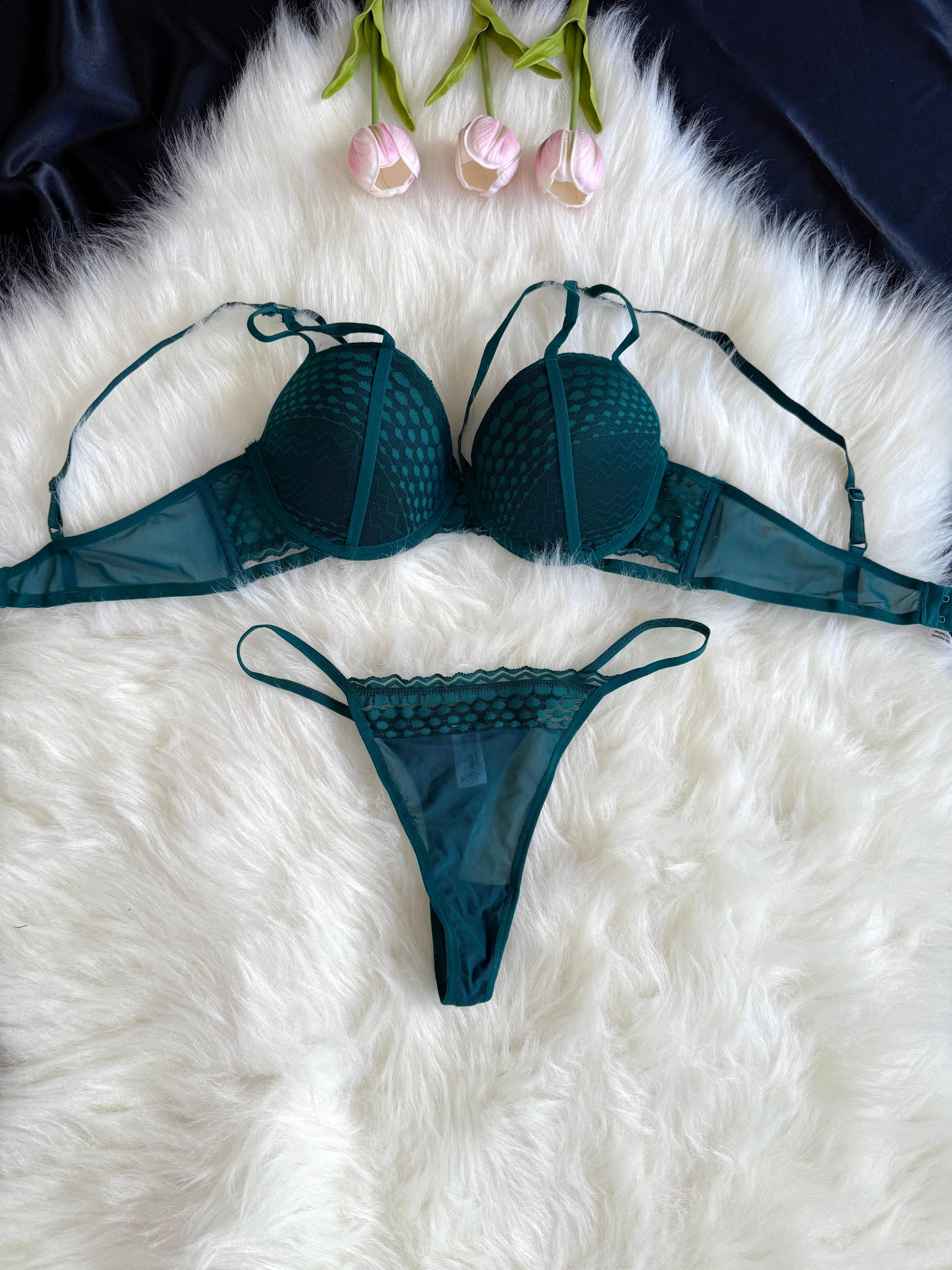 Yeşil Dolgulu Balenli Üstten Üç İpli Sütyen Takım