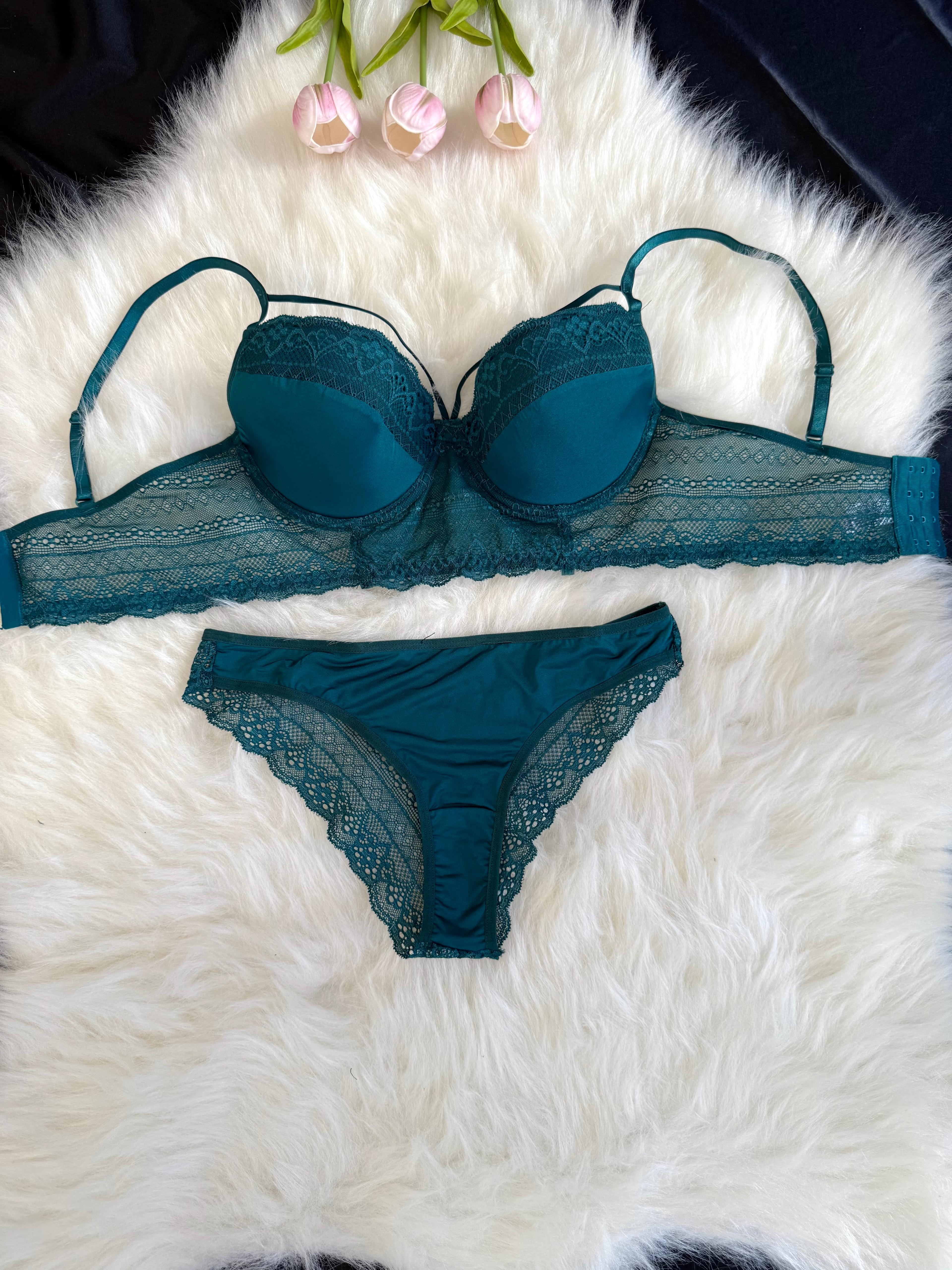 Yeşil Dolgusuz Balenli Alttan Dantelli İpli Sütyen Takım